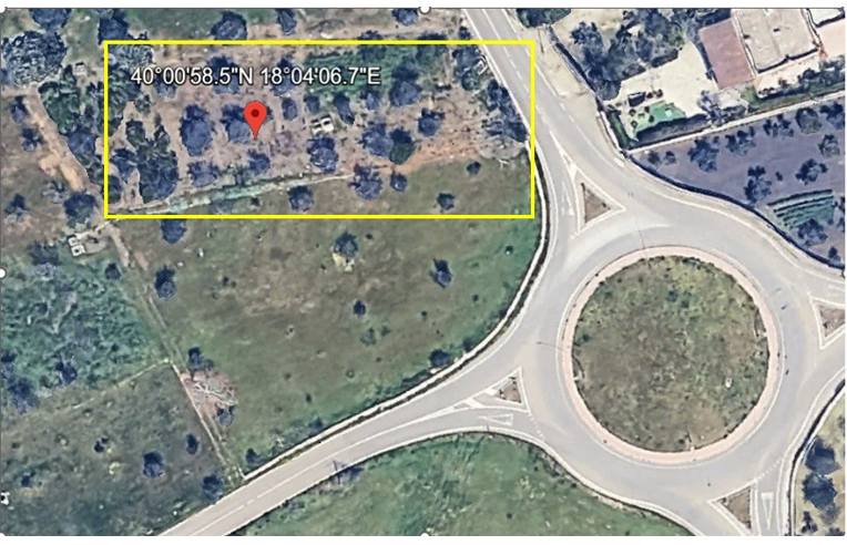 FONDO 1 GALLIPOLI – Zona Feo Superficie: 1.615 mq, accesso diretto da strada asfaltata (incrocio SP54 con SP223), coordinate GPS: 40°00'58.5"N 18°04'06.7"E,